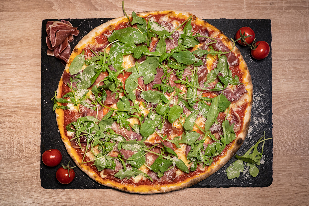 Sugo, mozzarella, prosciutto crudo, rukola, italský tvrdý sýr