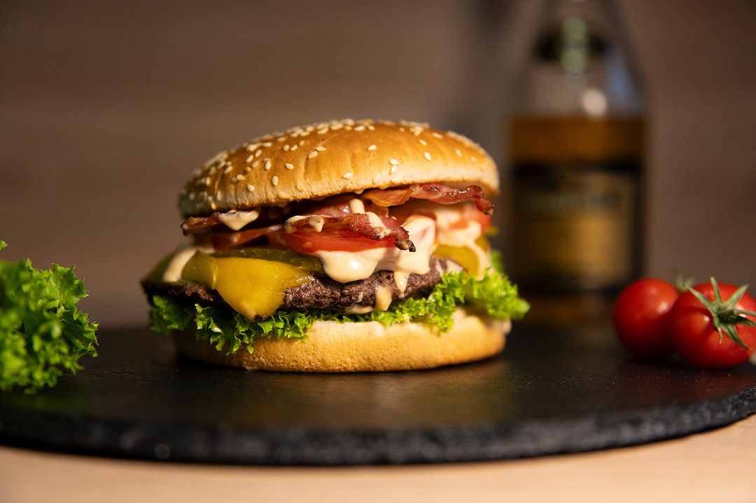 Burgerová bulka, hovězí mleté maso 200g, salát, rajče, kyselá okurka, cheddar, opečená slanina, domácí majonézový dresing