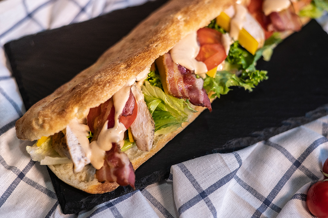 Grilované kuřecí prso SOUS-VIDE 120g, čedar, domácí majonézový dresing, rajče, salát římský, salát lolo Bionda, křupavá slanina