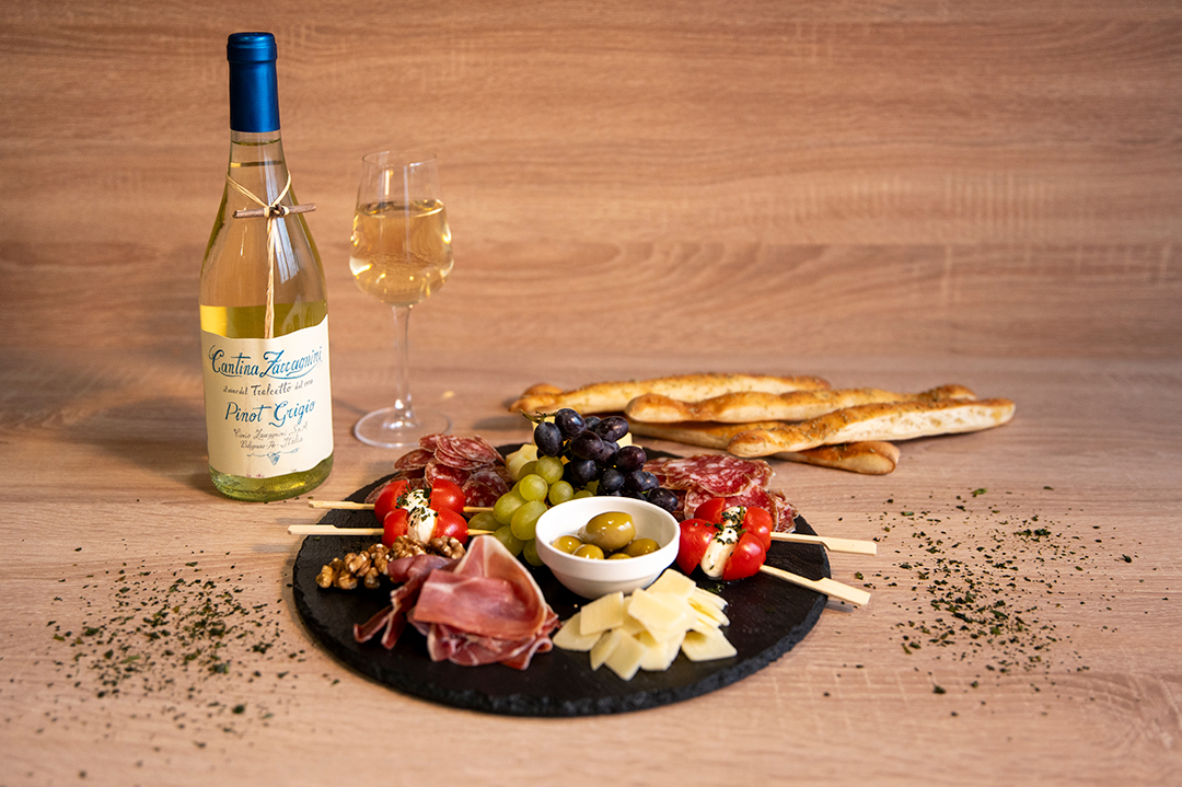 Výběr italských sýru a uzenin, hroznové víno, vlašské ořechy, olivy, rozmarýnové rohlíčky.